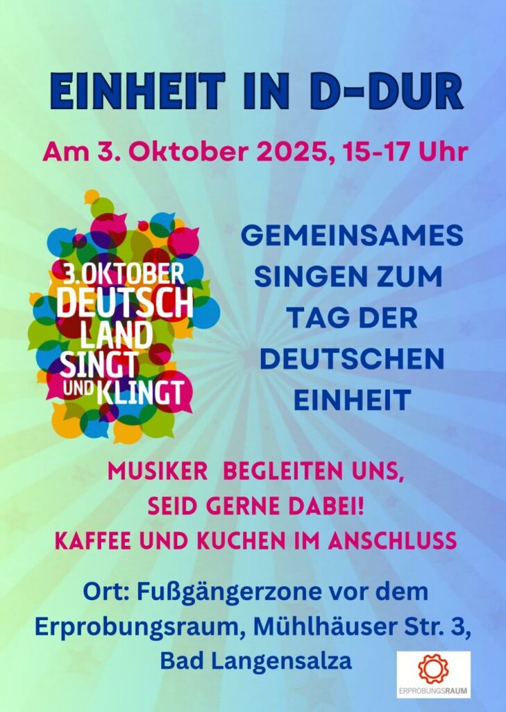 Am 3. Oktober werden wir gemeinsam zum Tag der Deutschen Einheit Lieder singen. Sei dabei! Im Anschluss gibt es Kaffee und Kuchen im Erprobungsraum.
